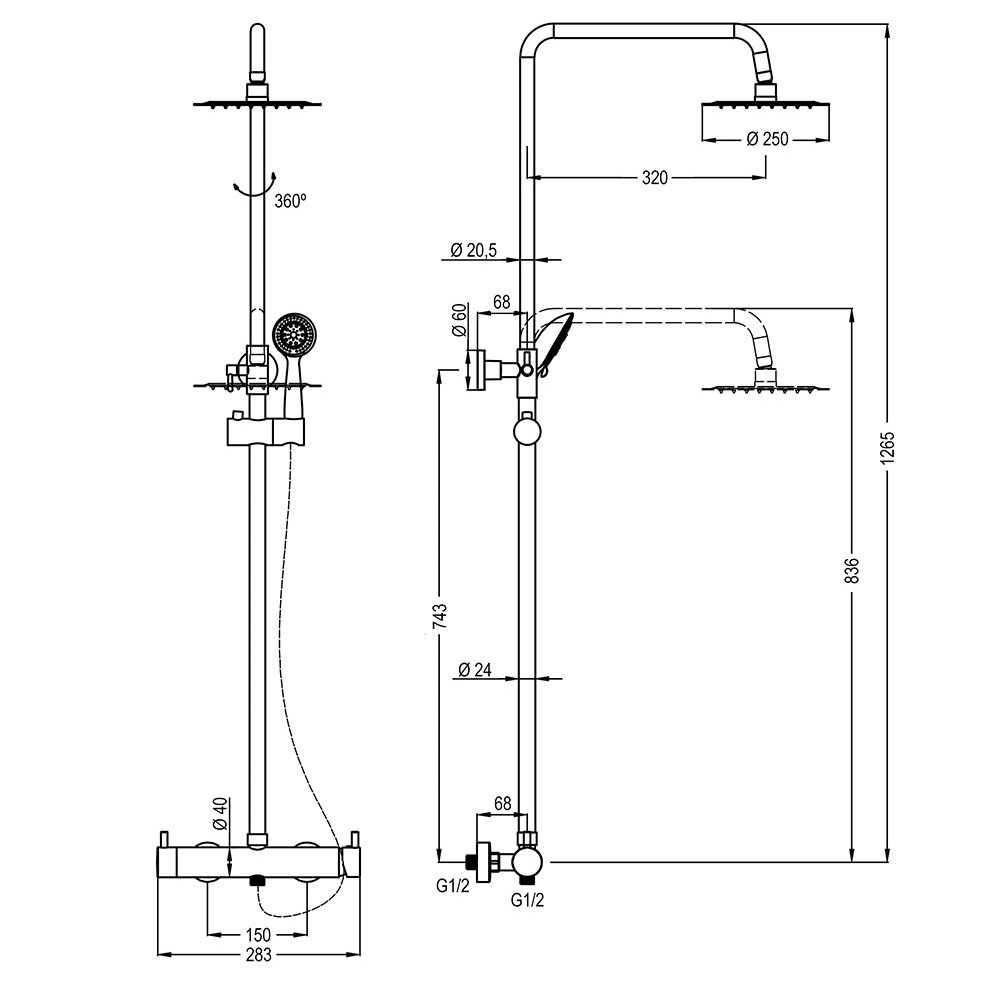 Para ver los precios acceda como usuarioLeer másColumna de ducha monomando modelo CHEROKEE y tubo cuadrado extraplano regulable en altura de 73 a 122 cm. Incluye ducha de mano y rociador con diseño cuadrado